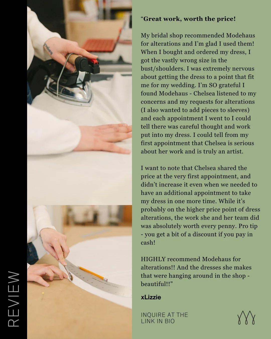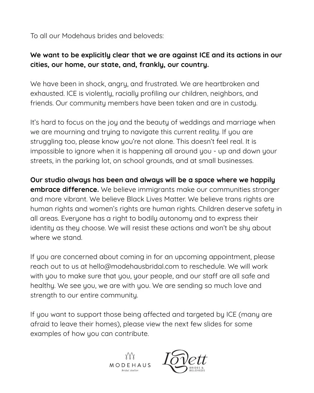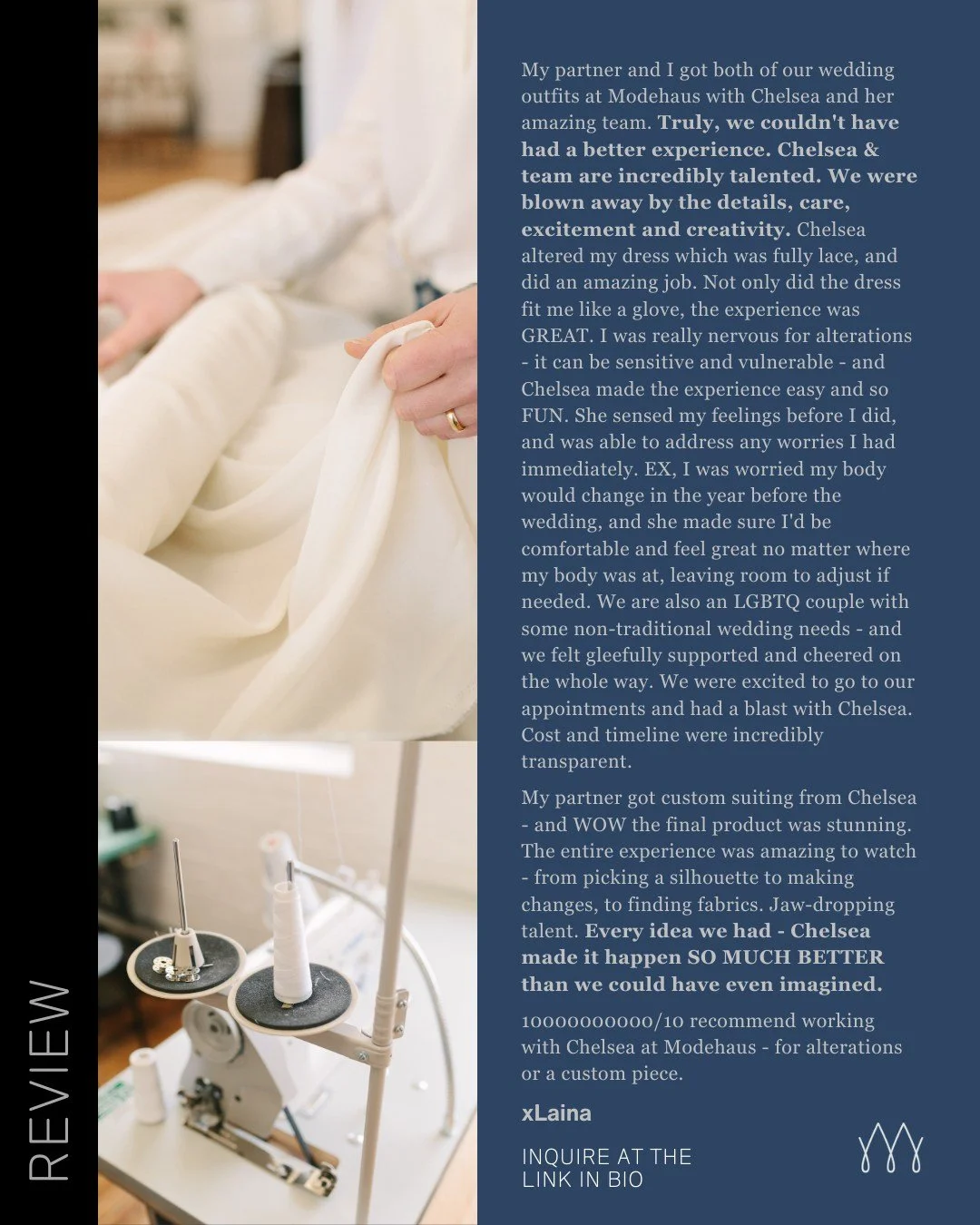 At Modehaus Bridal, we love love. No matter who you are or who you love, we want to be part of your big day. Whether that means fitting you for a modern, elegant gown from one of our collections or custom-designing a chic pant suit, we take pride in helping brides and beloveds express their best, most authentic selves.